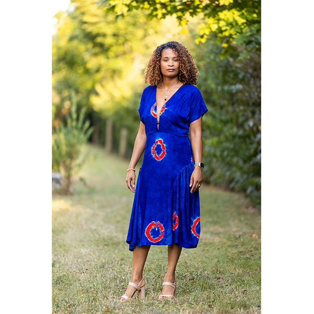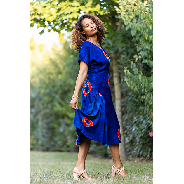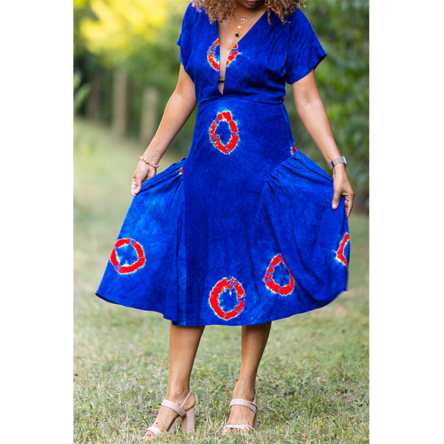 Robe midi en kokodunda à col V, fluide à manches courtes, réalisée dans un coton kokodunda teint à la main. Sa coupe midi légèrement évasée et son col en V assurent confort et élégance, tandis que les motifs circulaires apportent une finition artisanale unique.